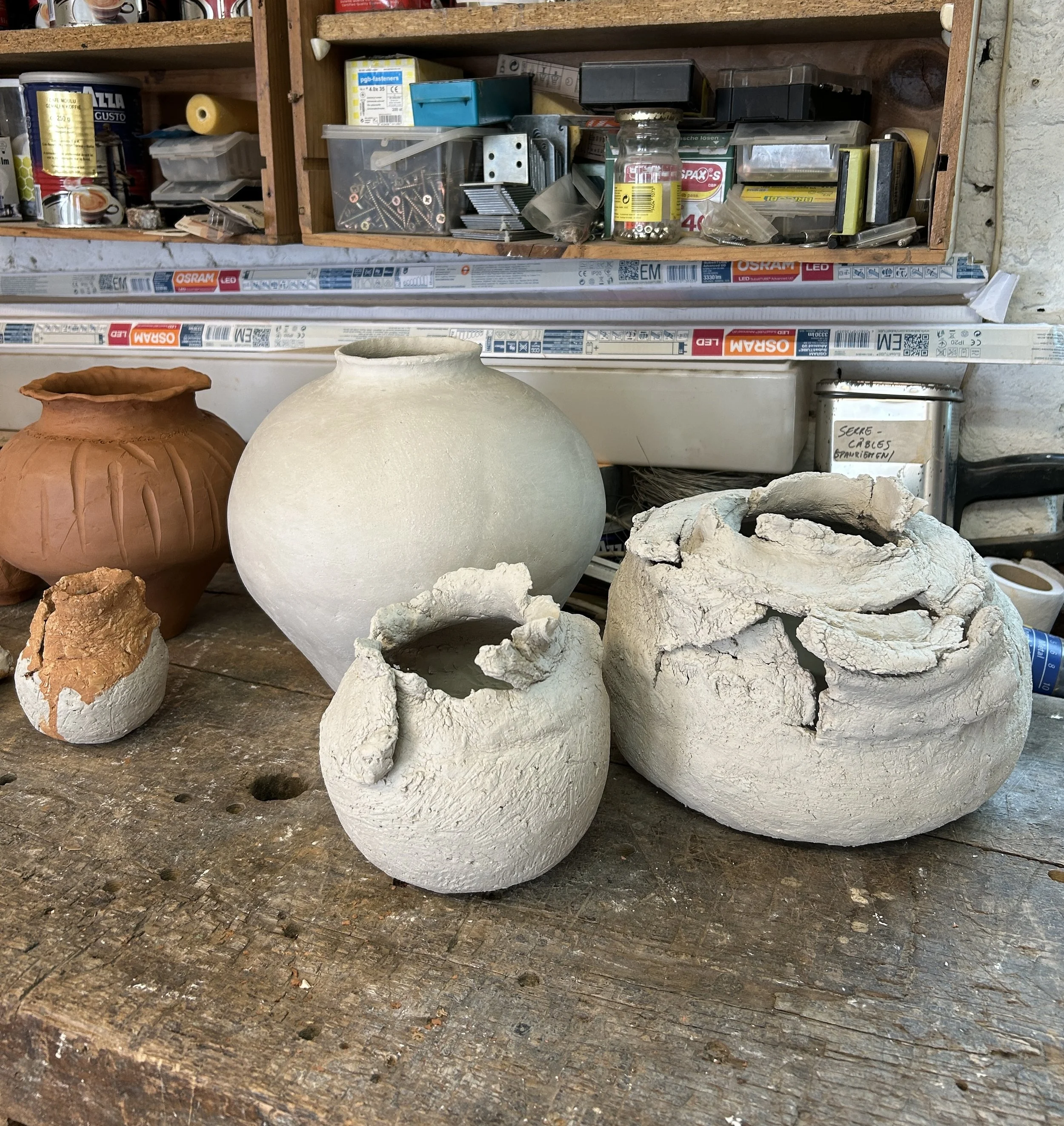 While Françoise has been doing glaze tests, I have been experimenting with different vase forms, inspired by some of the archaeological pieces we saw at the Royal Museum Mariemont, (Research & Inspiration blog September 30th). Rather than just creating unified pieces from the beginning, my focus has been on exploring how to accentuate the appearance of our earth, and how to make vases by piecing together broken fragments from another vase. Just like our country, the vases made in this way are not planned and created whole from the start, but have come together in a tumultuous, improvised way. And the fragments used to make the vases are not individually perfect, but together they can still make something beautiful.